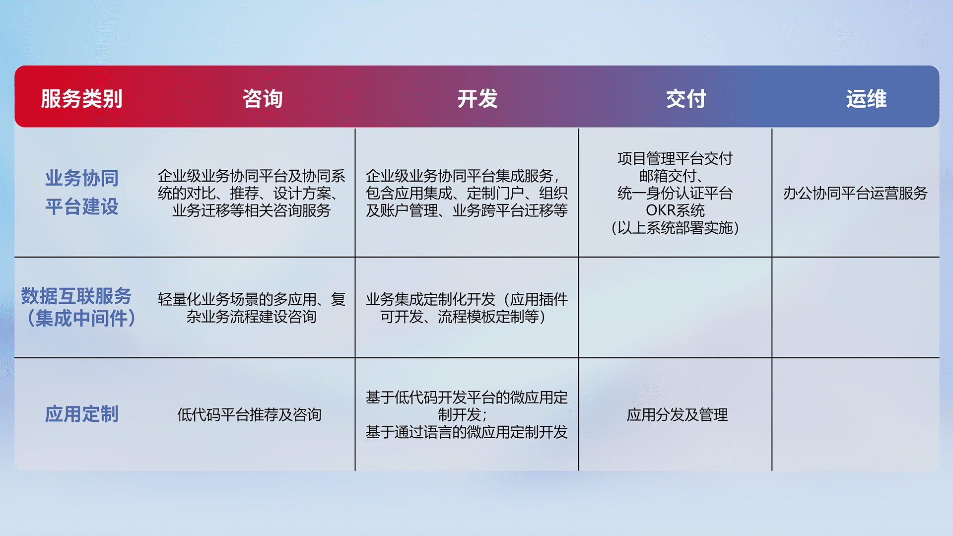 针对钉钉、、企微、、IDaas等平台级产品提供产品的规划、、方案、、、交付、、、、定制化开发等服务,,实现如统一协同办公、、、、智能客户服务、、混合会议管理、、、智能数据查询、、、、等业务场景,,,实现数字化转型。。。